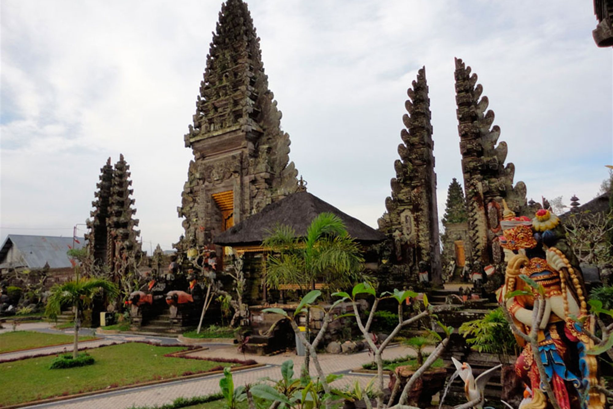 Templo Madre Besakih incluido almuerzo Salimos del hotel a las 09.00 para ver los lugares de interés: Klungkung visitamos Kertagosa, la corte de justicia donde orginariamente se alojaba el alto tribunal real y Taman Gili, el jardín del pozo. Los dos pabellones son todo lo que se conserva del Palacio real de Klungkung que fue destruido casi por completo en 1908. El en canto autóctono es el techo de cada uno que tiene los mejores ejemplos de pinturas clásicas balinesas. Besakih es un complejo de 22 templos como madre de miles de templos en Bali.. Ocupa 3 km cuadrados en las laderas del volcán Agung (3142 m). Fué fundado a finales del siglo VIII Hoy es el foco del hinduismo indonesio. Goa Lawah es un templo de más de mil años de antiguedad (frente al mar), y detrás la cueva como elemento principal del templo, habitada por docenas de miles de murciélagos fructivoros. Comida incluida en Restaurante Bukit Jambul desde el cual se disfruta de una vista muy bonita de las Colinas y arrozales escalonados hasta el mar.